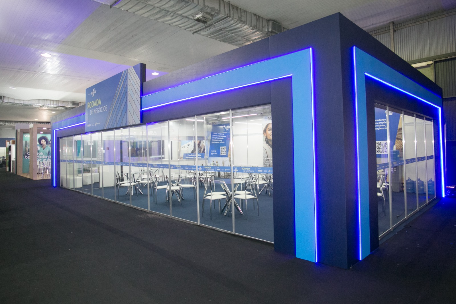 Paredes em painel TS branco estruturadas em perfil de alumínio. Piso de carpete e testeira de identificação com o nome do cliente. Iluminação e mobiliário.